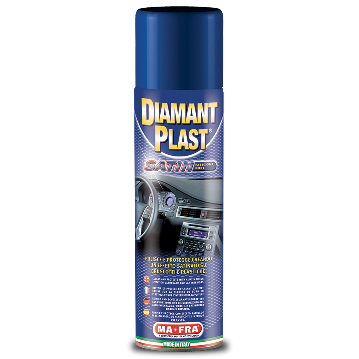 DIAMANT PLAST SATIN de MA-FRA est le rénovateur de tableau de bord à effet mat, facile et rapide à utiliser, pour protéger et renouveler les parties traitées tout en laissant la surface lisse au toucher.