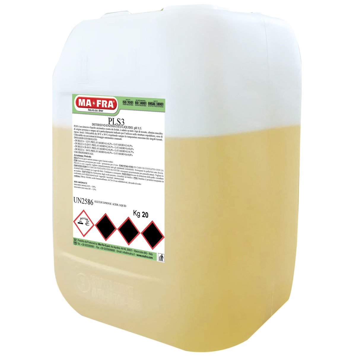 PLS3 est un détergent liquide enzymatique sans phosphates, adapté à tous types de tissus, élimine les taches d’origine protéique et de sang et il est particulièrement recommandé pour une utilisation dans les structures hospitalières, maisons de retraite, hôtels.