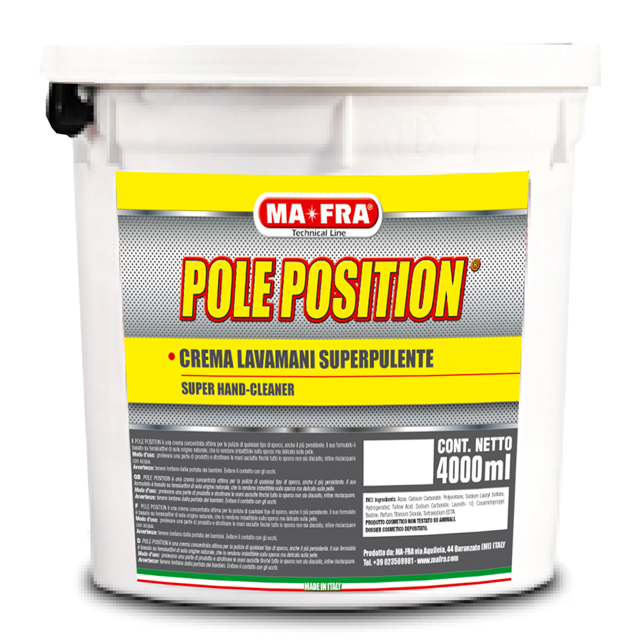 Pole Position est une pâte crémeuse concentrée à haut pouvoir lavant. Les abrasifs inertes micronisés offrent une efficacité nettoyante contre tout type de saleté tenace. Pole Position est formulée avec des savons et des tensioactifs d’origine naturelle végétale provenant de ressources renouvelables ainsi qu’un extrait d’Aloe. Laisse les mains douces et agréablement parfumées. Compatibilité cutanée testée dermatologiquement.