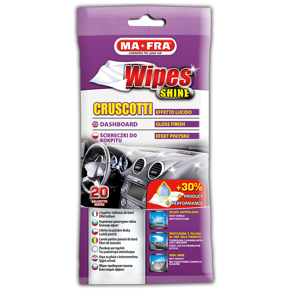 Wipes Shine sont les lingettes jetables de Mafra pour redonner au tableau de bord de votre voiture décoloré par le soleil sa couleur brillante et originale, tout en créant une barrière anti-poussière protectrice, le tout sans effet gras.